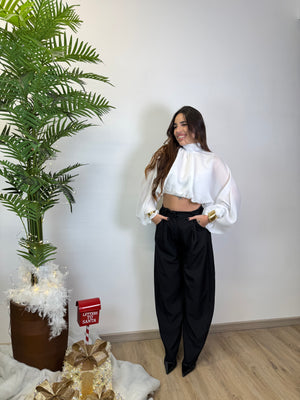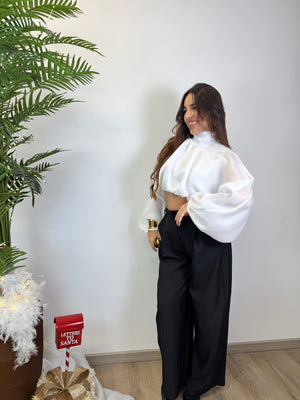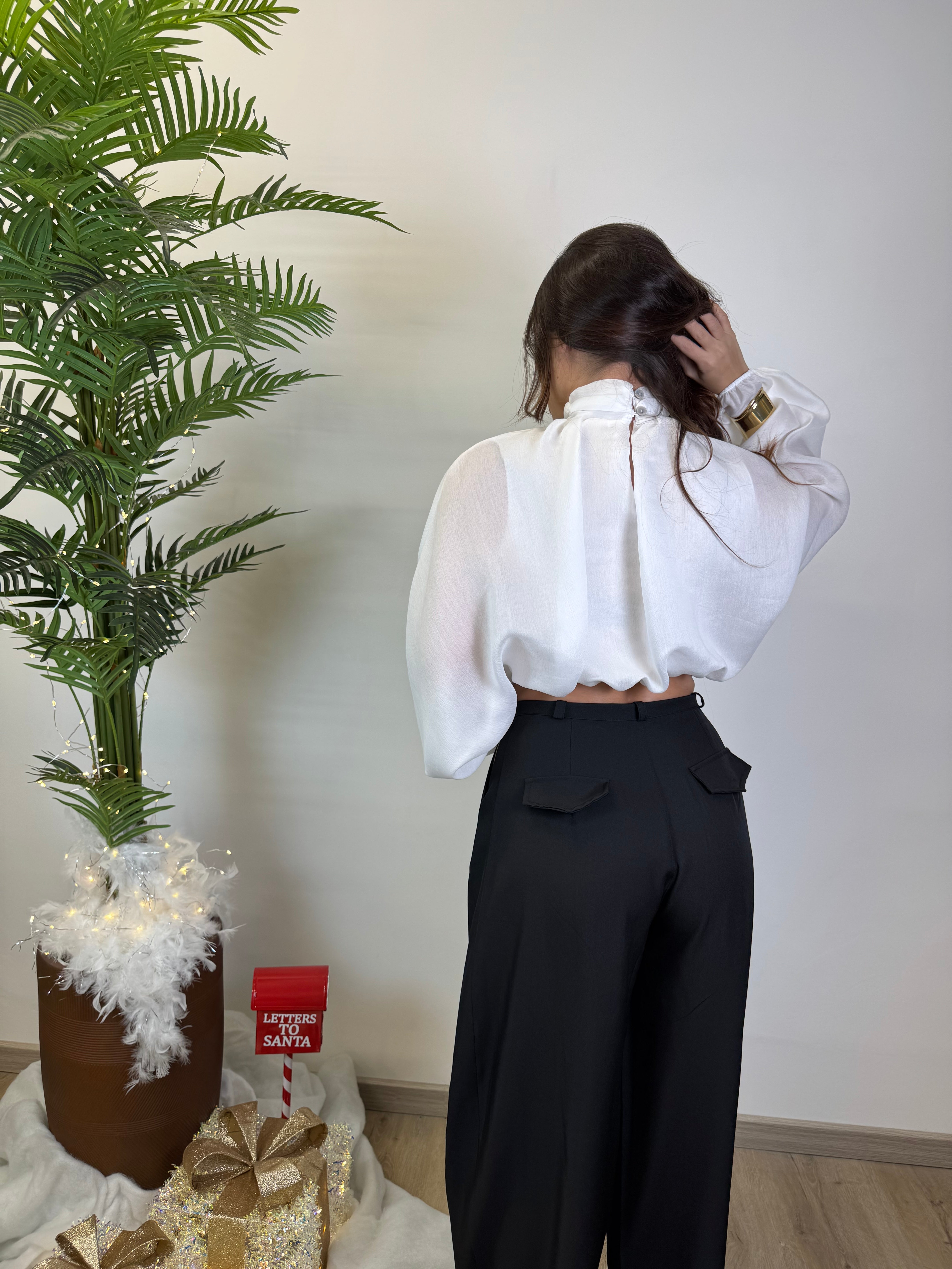 CAMICIA CROP CON MANICHE SEMITRASPARENTI E A PALLONCINO. TAGLIA UNICA VESTE DA XS A L
