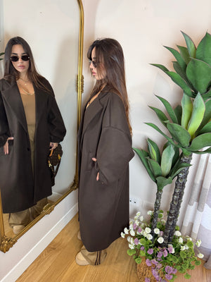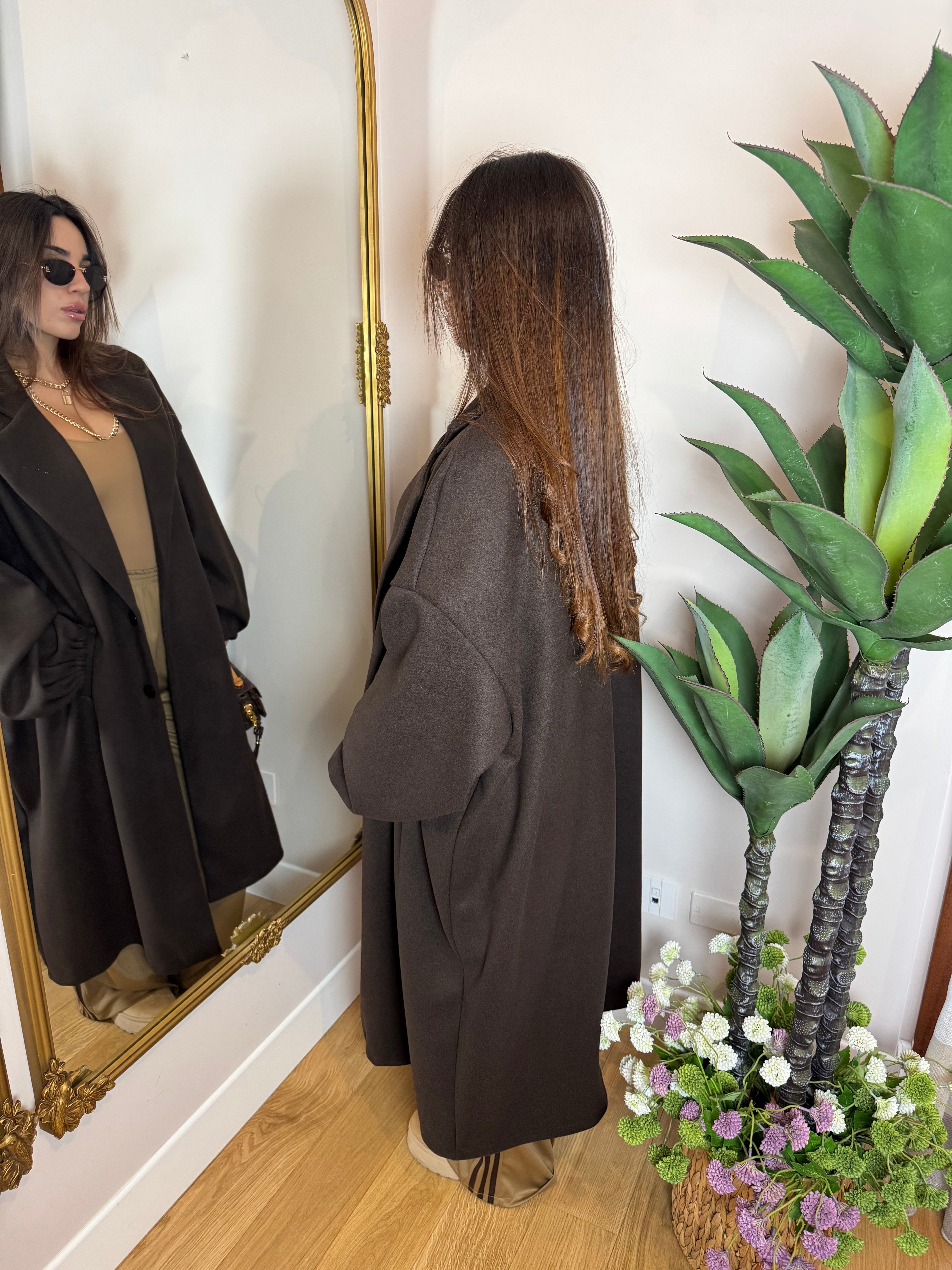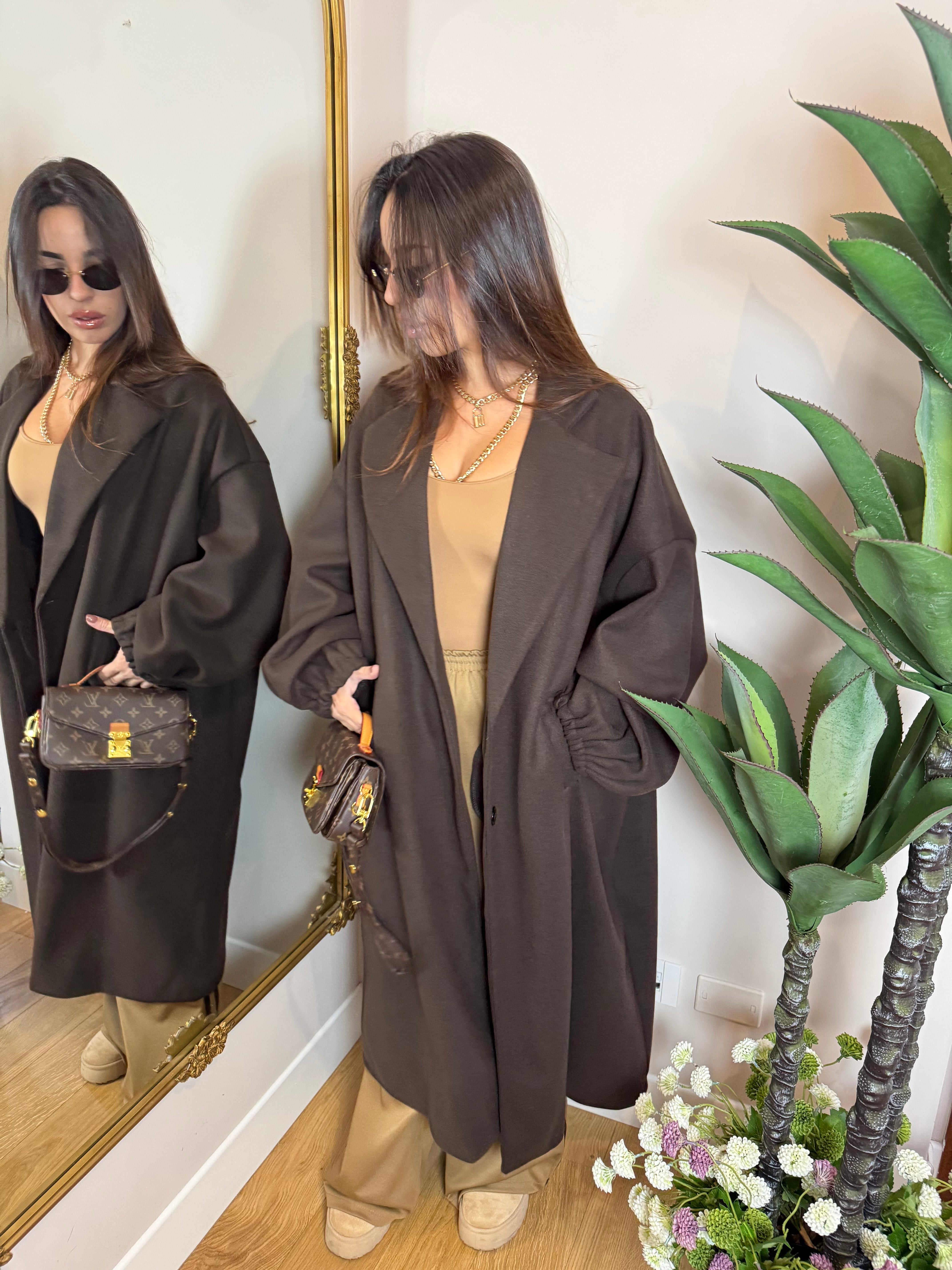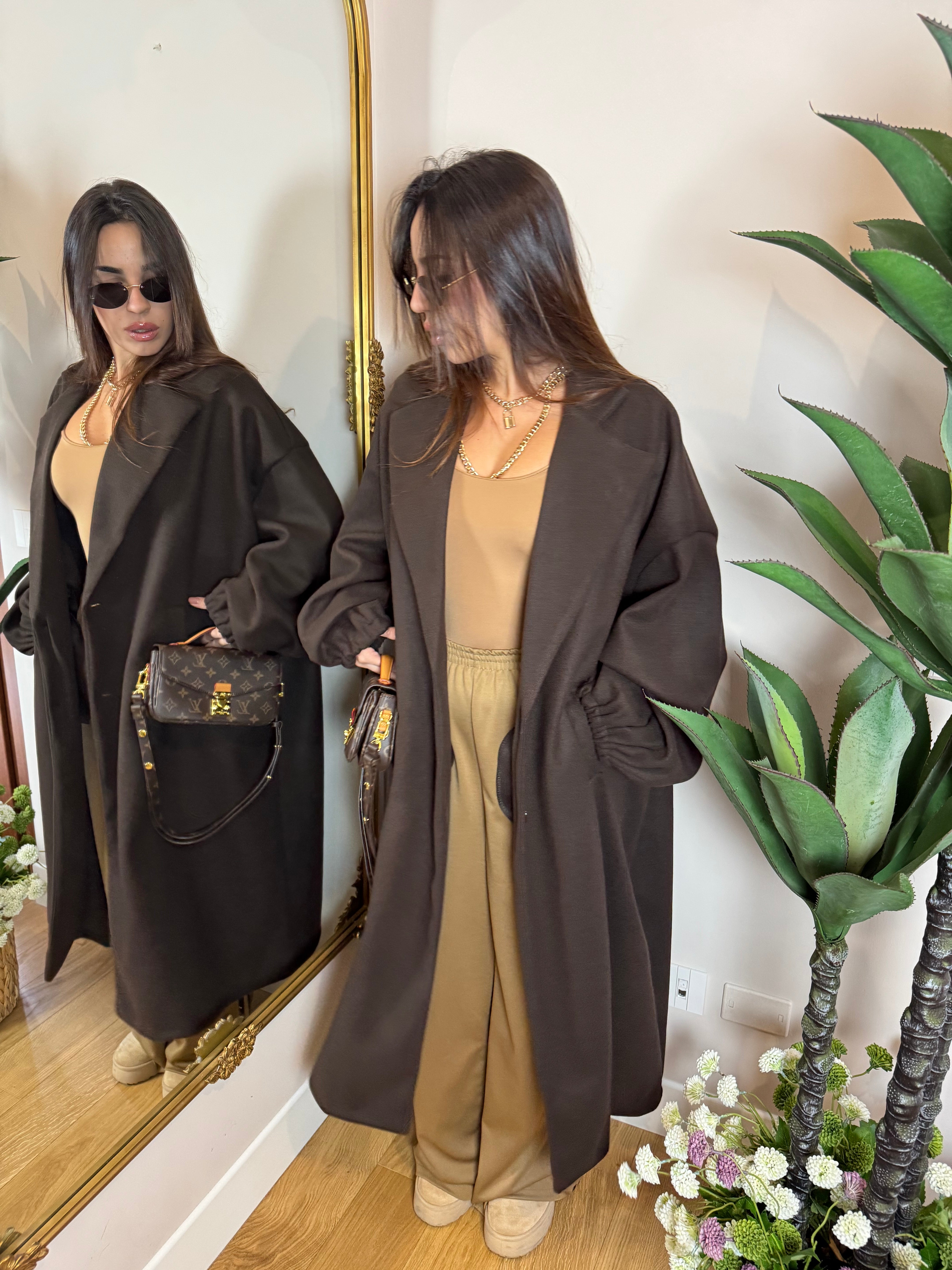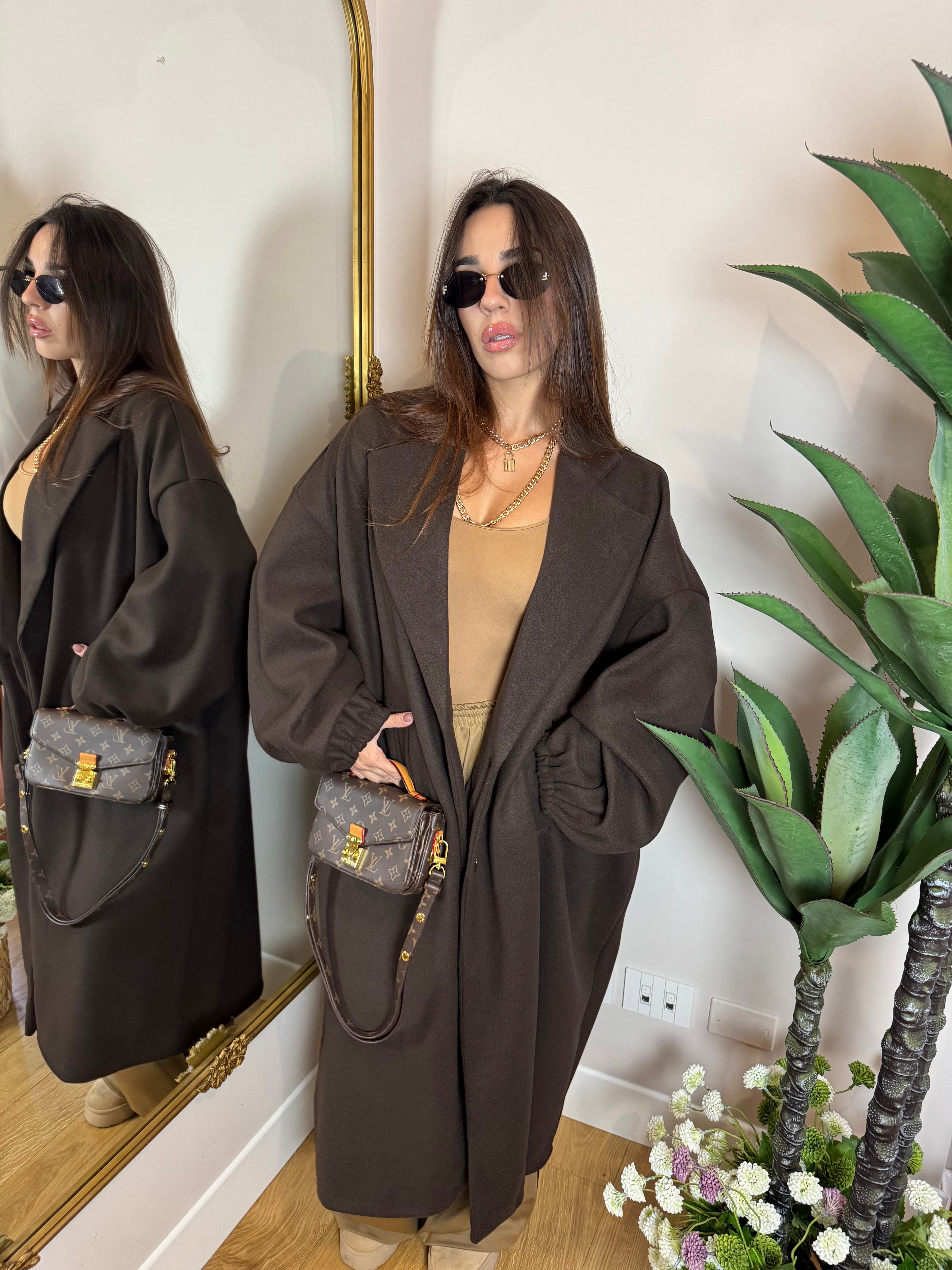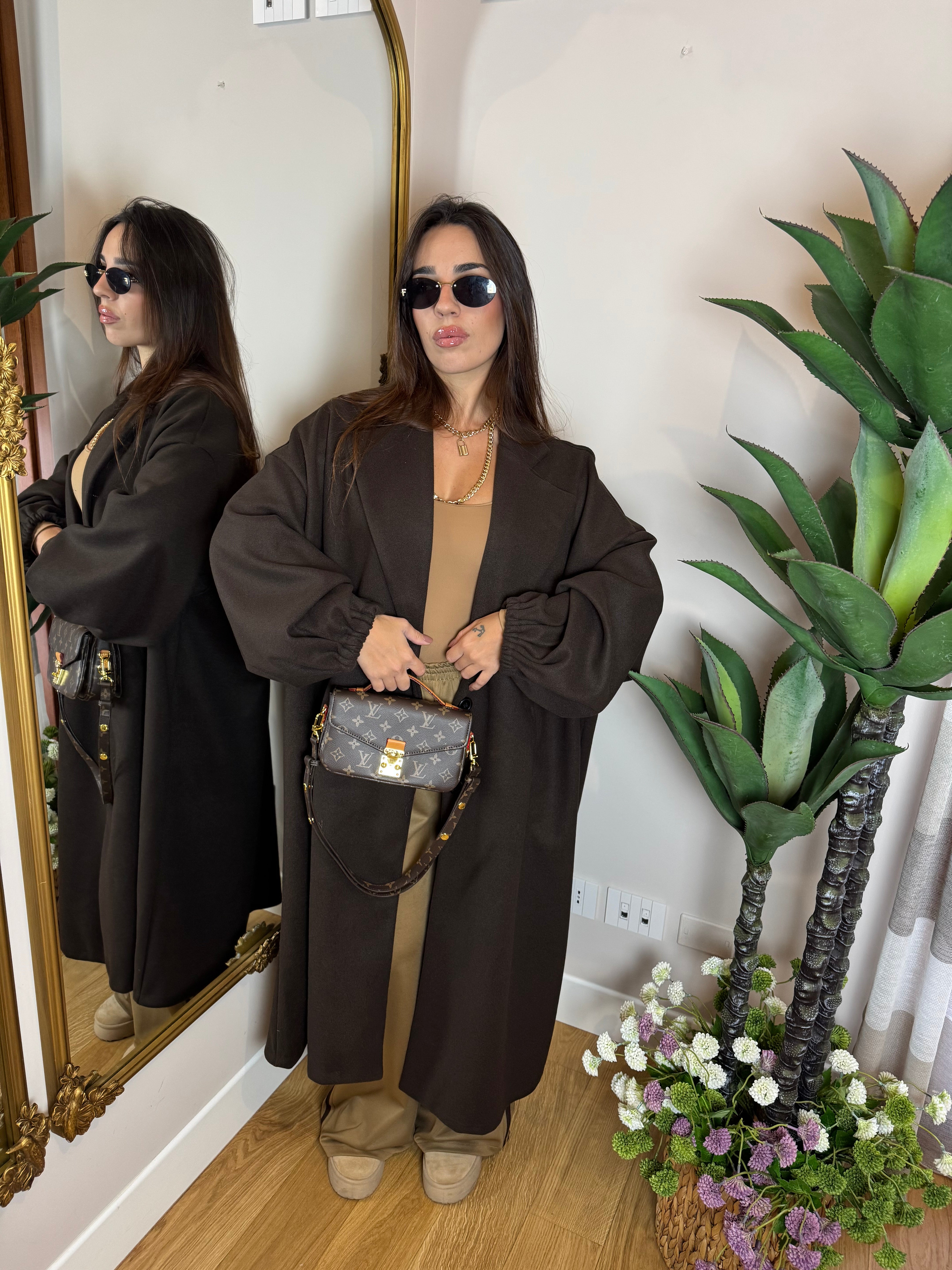CAPPOTTO IN PANNO MEGA OVER, NON Eè FODERATO ALL'INTERNO MA RESTA SUPER CALDO ED AVVOLGENTE, PRESENTA DELLE TASCHE E DELLE MANICHE A SBUFFO, TAGLIA UNICA VESTE FINO AD UNA XL, DUE VARIANTI DI COLORE DISPONIBILI. MISURE DELLA MODELLA, TAGLIA 40-42 ALTEZZA 165CM