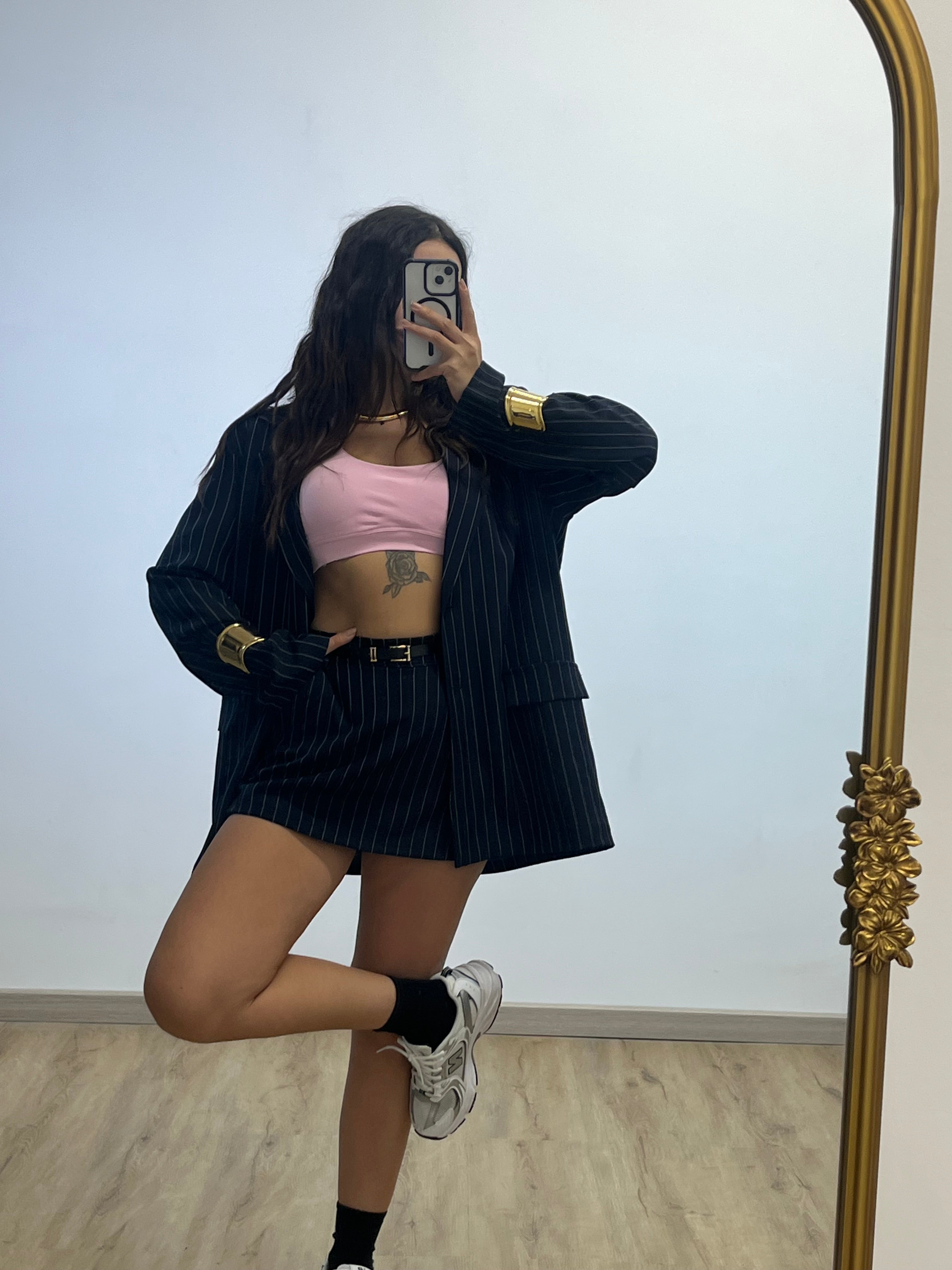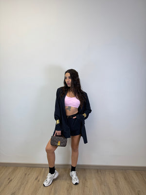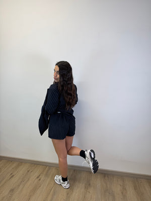 COORDINATO GESSATO COMPOSTO DA BLAZER OVER E GONNA PANTALONCINO CON CINTA INCLUSA PORTA ELASTICO SUL RETRO TAGLIA UNICA VESTE DA XS A L