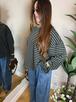 MAGLIA A RIGHE VERDE E NERA, VESTIBILITA OVER E MANICHE AMPIE TAGLIA UNICA VESTE FINO AD UNA XL, MISURE DELLA MODELLA: TAGLIA 40-42 ALTEZZA 165CM