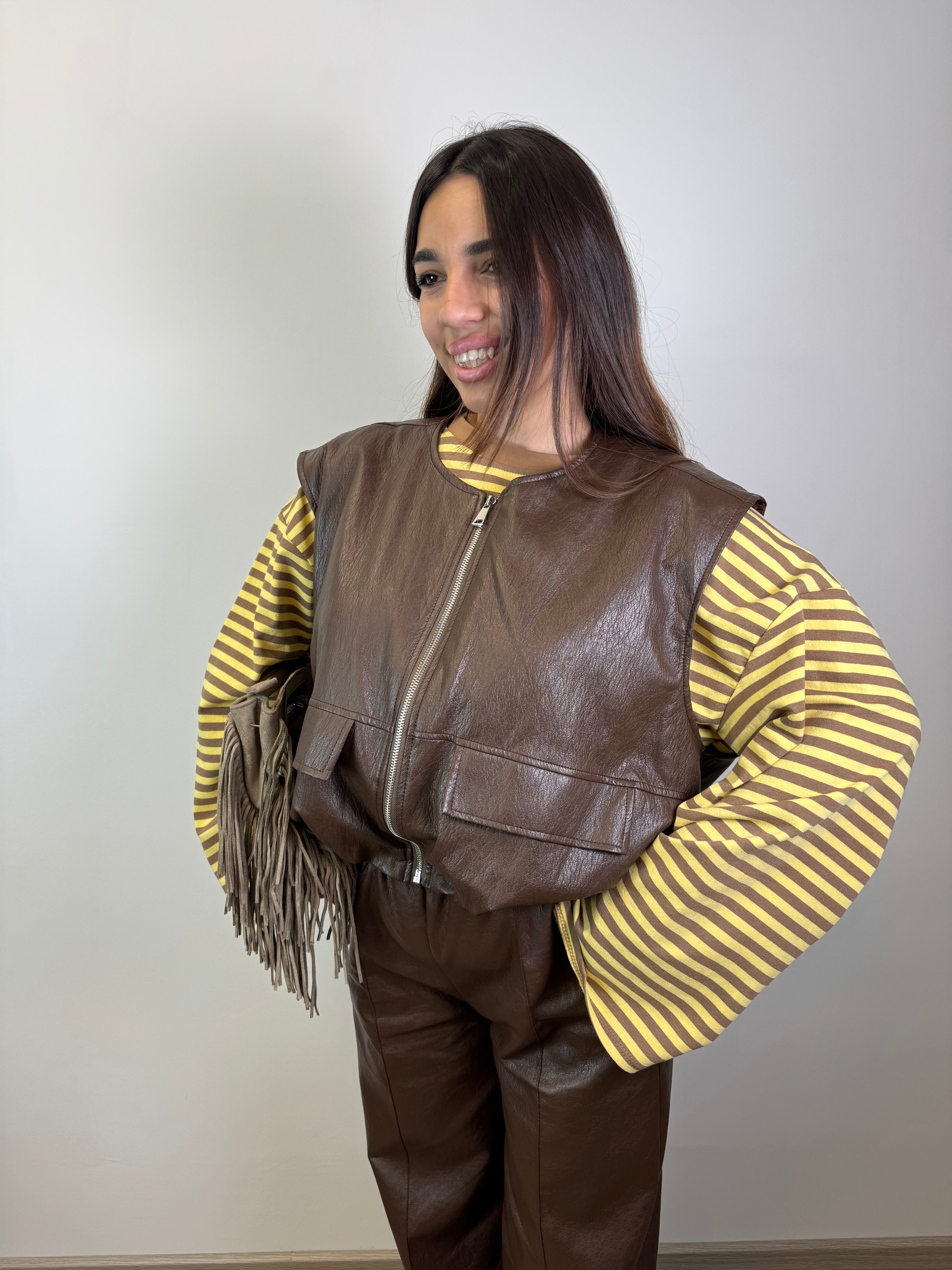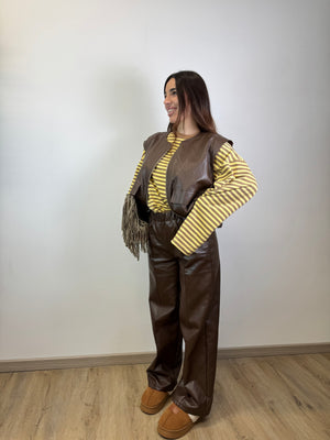 GILET OVER FODERATO ALL’INTERNO PANTALONE IN ECOPELLE VESTE FINO AD UNA M ABBONDANTE