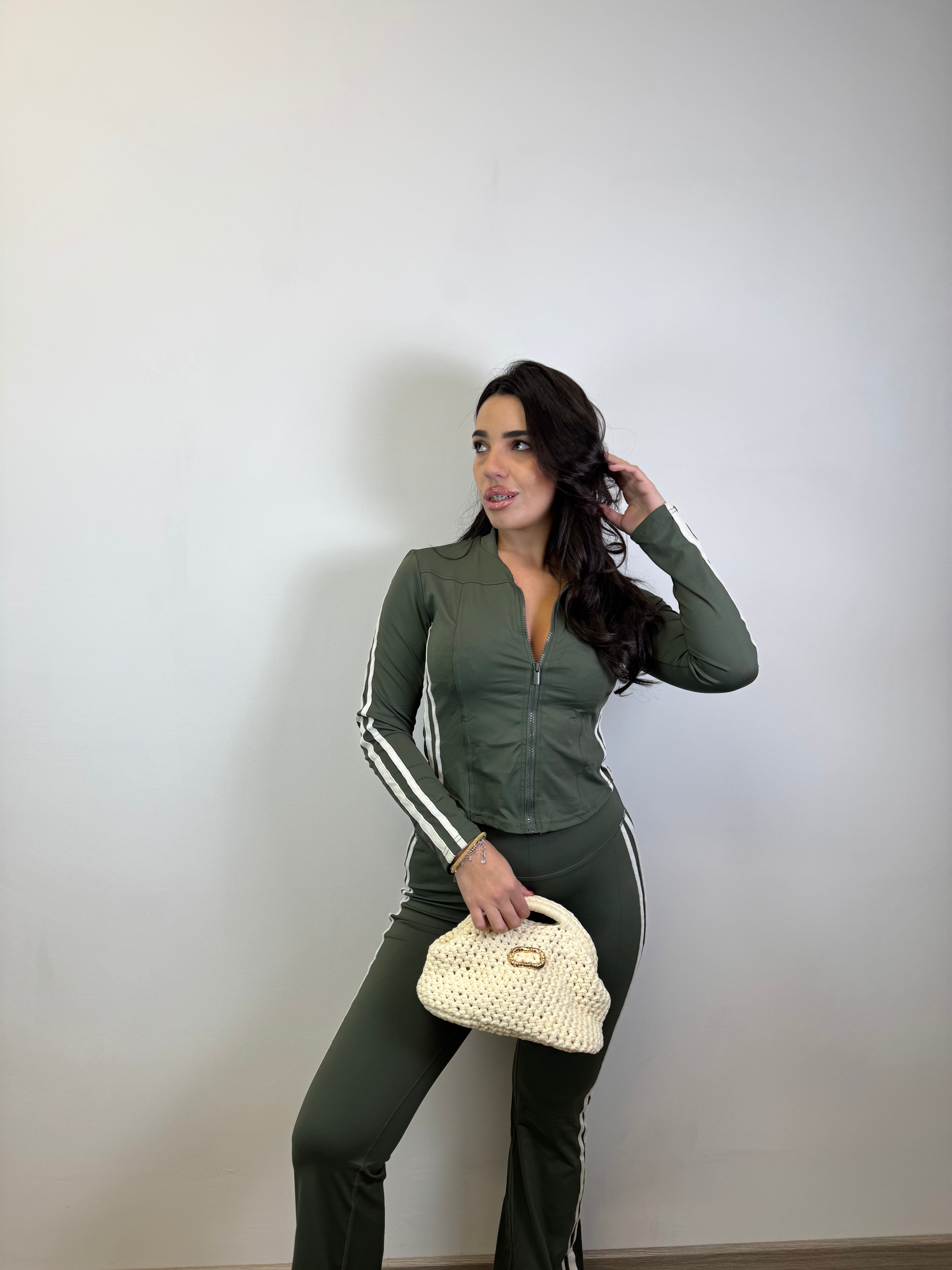 COORDINATO IN TESSUTO MODELLANTE CON BANDE SUI LATERALI, COMPOSTO DA PANTAONE LEGGERMENTE A ZAMPA E GIACCHETTINO CON ZIP, TAGLIA UNICA VESTE DA XS A L