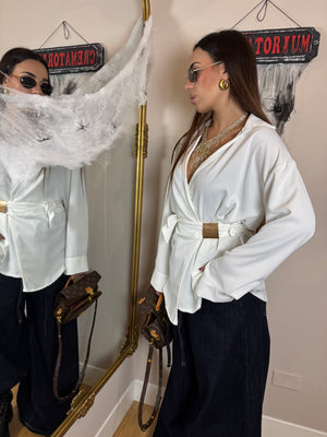 CAMICIA CON DETTAGLIO INCROCIO E NODO ORO IN ACCIAIO. TAGLIA UNICA VESTE FINO AD UNA XL