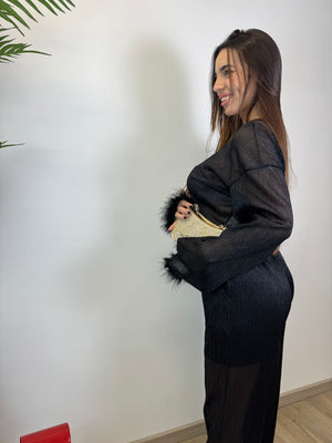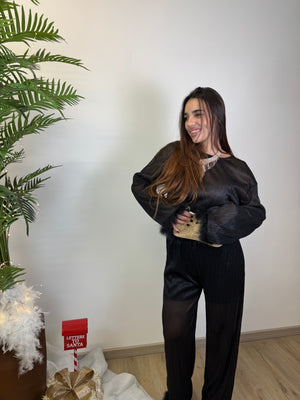 COORDINATO SEMI TRASPARENTE, LEGGERMENTE BRILLANTINATO CON PIUME SUI POLSINI DELLE MANICHE E SUL PANTALONE, TAGLIA UNICA VESTA DA XS A L