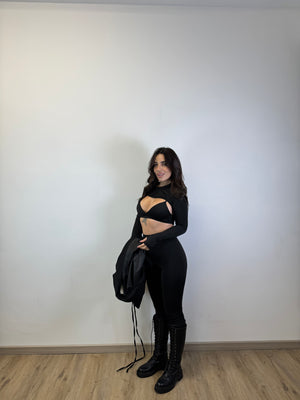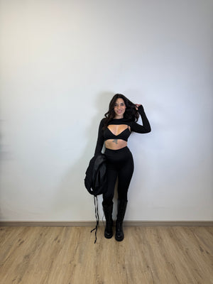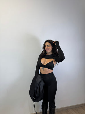 COORDEST TRE PEZZI COMPOSTO DA LEGGINS MODELLANTI, TOP A TRIANGOLO CON COPPE PREFORMATE E SPALLINE REGOLABILI E COPRISPALLA CON MANICOTII, IN LYCRA ED ELASTENE TAGLIA UNICA VESTE DA XS A L