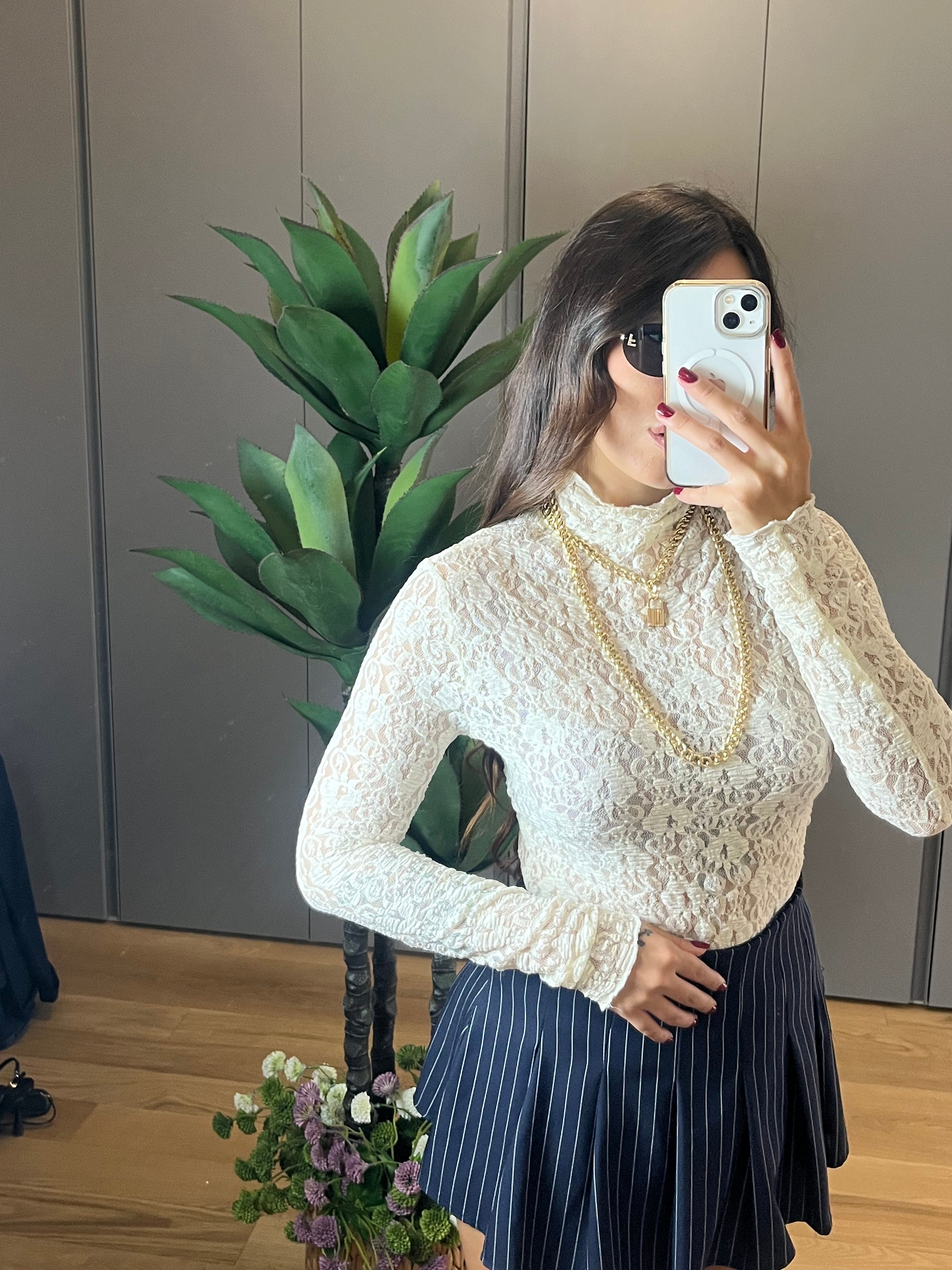 Maglia in pizzo con colletto, super aderente taglia unica veste fino a massimo una M