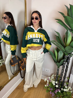 Pantalone in cotone, morbido e confortevole vestibilità ampia, la modella indossa taglia M ed è alta 167 due varianti di colore disponibile, porta il laccio in vita per poter stringere o allargare